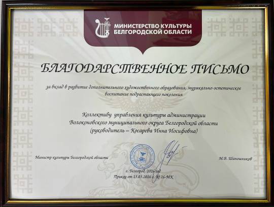 Коллектив управления культуры Администрации Волоконовского муниципального округа поощрен Благодарственным письмом министерства культуры Белгородской области за вклад в развитие дополнительного художественного, музыкально-эстетического воспитания подрастающего поколения!